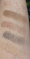 The eye shadow shades are Ivory, Oyster Grey Metallic, Antique Pink Shimmer Wash, Chateau Grey, Taffeta Metallic, Birch, Heather Rose Shimmer Wash, Navy Charcoal, Gold Thread Metallic, and Espresso (for lining on me).